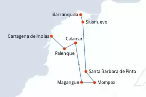 Itinerario : Cartagena de Indias, Palenque, Calamar, Magangue, Mompox, Santa Barbara de Pinto, Sitionuevo, Barranquilla