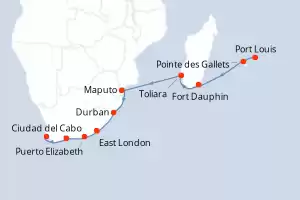 Itinerario : Ciudad del Cabo, Puerto Elizabeth, Durban, Mayotte, Nosy-Bé, Antisiranana, Port Louis