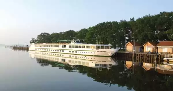Construido en 2.009, el MS Victor Hugo fue completamente remodelado en 2.019. Tiene 82 metros de eslora por 9,5 metros de manga y, sus 2 cubiertas interiores, albergan 45 camarotes que permiten embarcar a 90 pasajeros.
