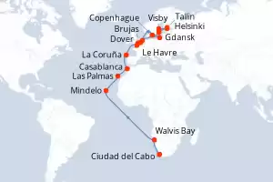 Itinerario : Ciudad del Cabo, Walvis Bay, Mindelo, Las Palmas, Casablanca, La Coruña, Le Havre, Brujas, Gdansk, Visby, Helsinki, Tallin, Estocolmo, Copenhague, Ijmuiden, Dover