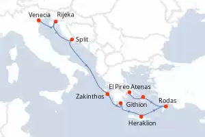 Itinerario : Venecia, Rijeka, Split, Zakinthos, Githion, Heraklion, Rodas, Mykonos, El Pireo Atenas