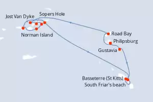 Itinerario : Philipsburg, Road Bay, Jost Van Dyke, Sopers Hole, Canal de San Francis Drake, Norman Island, Islas Virgenes, Spanish Town, South Friar's beach, Basseterre (St Kitts), Gustavia, Philipsburg