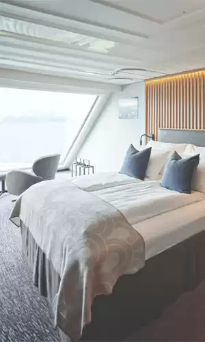Los camarotes y suites a bordo de Havila Voyages ofrecen un alto nivel de confort hotelero. Cada uno constituye un refugio de diseño nórdico depurado, mucho más amplio que la media habitual en esta línea. Grandes ventanas (incluso en algunas categorías estándar) te permiten no perderte nada del espectáculo natural. Las suites, situadas a menudo en la proa o en la popa de los barcos, disfrutan de espectaculares balcones privados y de servicios atentos (desayuno exclusivo, embarque prioritario), garantizándote una experiencia altamente exclusiva frente a los elementos.