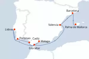 Itinerario : Palma de Mallorca, Barcelona, Valencia, Gibraltar, Lisboa, Portimao, Cadiz, Malaga