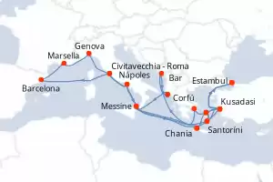 Itinerario : Estambul, Kusadasi, Santoríni, Mykonos, Chania, Messine, Nápoles, Civitavecchia - Roma, Barcelona, Marsella, Genova, Civitavecchia - Roma, Nápoles, Chania, Santoríni, Kusadasi, Mykonos, El Pireo Atenas, Bar, Corfú, Messine, Santoríni, Mykonos, Kusadasi, Estambul