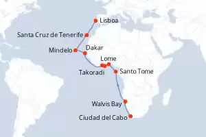 Itinerario : Ciudad del Cabo, Walvis Bay, Luanda, Santo Tome, Cotonou, Takoradi, Abidjan, Dakar, Mindelo, Santa Cruz de la Palma, Funchal, Cadiz, Lisboa