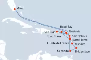 Itinerario : Bridgetown, Fort-de-France, Basse-Terre (Guadalupe), San Juan, Road Town, Saint John's, Gustavia, Road Bay, Miami
