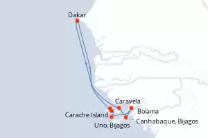 Itinerario : Dakar, Carache Island, Caravela, Uno, Bijagos, Bolama, Canhabaque, Bijagos, Maio Island Bijagos, Dakar