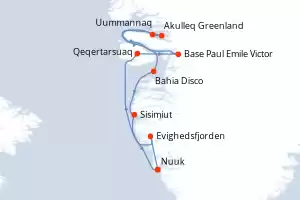 Itinerario : Nuuk, Qikiqtarjuaq, Bahia de Isabella , fGibbs fjord, Dundas, Beechey (île), Croker Bay, Cork, Qaanaaq, Buenos Aires, Uummannaq, Détroit de Vaigat, Ilulissat, Sisimiut, Nuuk