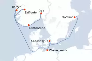 Itinerario : Estocolmo, Copenhague, Warnemunde, Eidfiordo, Bergen, Kristiansand, Oslo